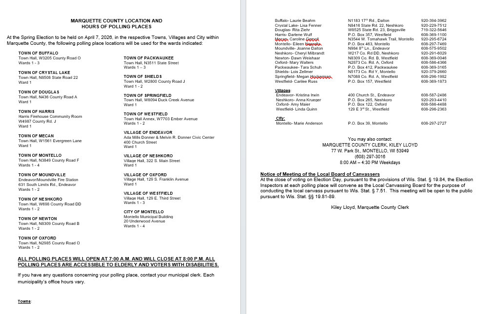 Notice 03-20-2026: To return an Absentee Ballot for the April 7th, 2026 election. Please mail to Town of Westfield, PO Box 157 Westfield, WI 53964 or they can be handed in in-person on Thursday April 2nd,2026 at 1 pm at the township polling place. You may also contact the clerk to make other arrangements if needed.